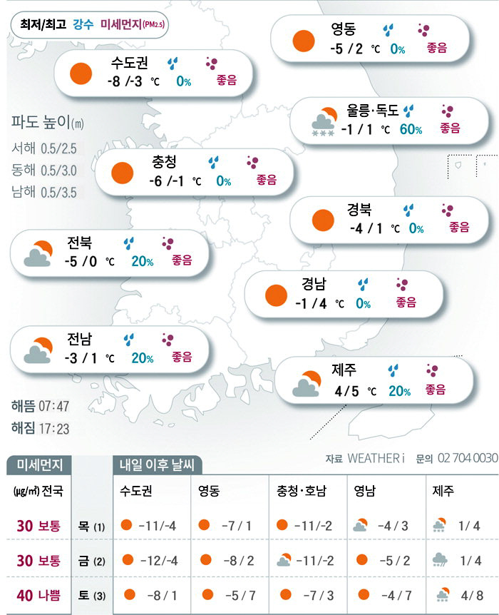 기상청에 따르면, 이번 한파는 북극 지역에서 발생한 찬 공기가 남하하면서 나타났습니다. 주말 동안 전국적으로 영하의 기온이 지속될 것으로 보이며, 특히 강원도와 경북 지역은 더욱 낮은 기온을 기록할 가능성이 큽니다. 이에 따라 사람들은 외출 시 따뜻한 복장을 갖추고, 노약자와 어린이들은 외부 활동을 자제하는 것이 좋겠습니다.